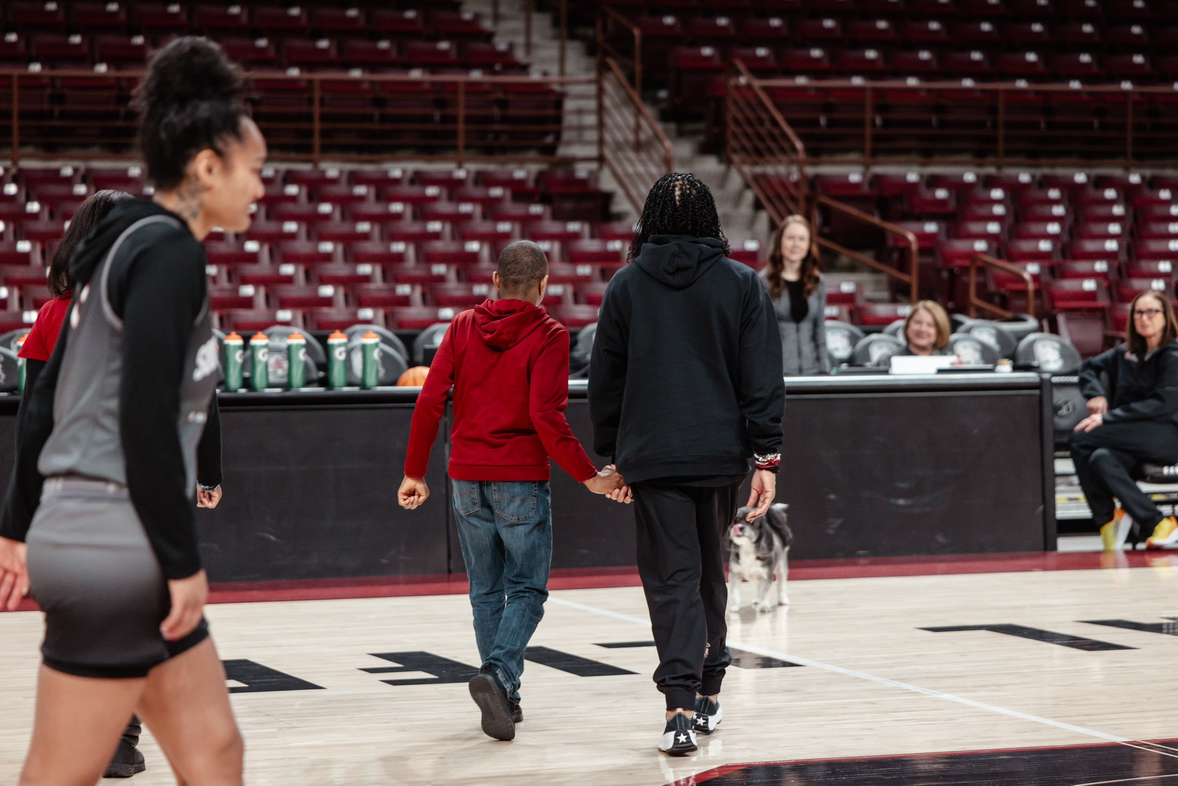 Upon arrival, Gabe was greeted with an entire backpack stuffed with USC Women’s Basketball swag before being escorted on an exclusive tour of the team’s locker room and facilities. After the tour, we settled into amazing seats to watch the team’s shootaround. The highlight? Coach Dawn Staley personally invited Gabe onto the court to break down the team huddle and introduce him to the entire squad! After snapping tons of pictures and collecting autographs, the whole gym cheered as Gabe stepped up to the freethrow line. When he made his basket, the arena erupted with applause, followed by a flurry of high-fives and hugs.