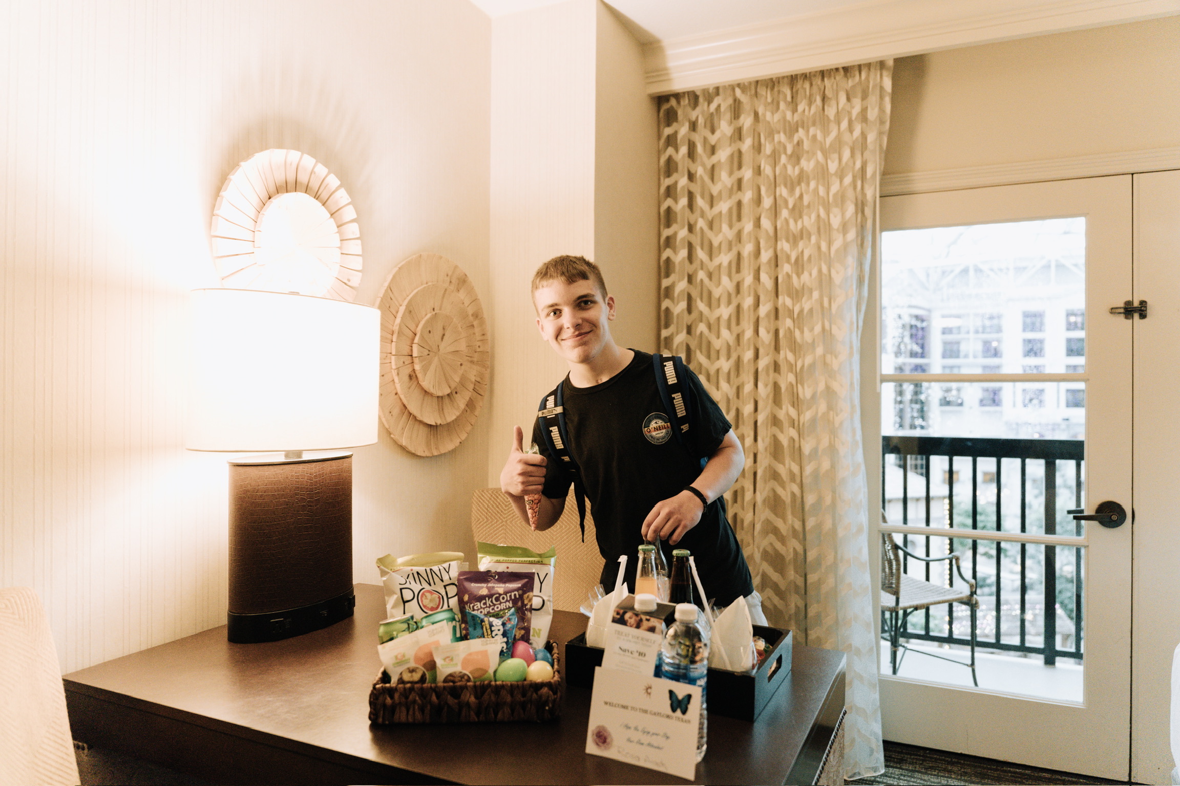 To make things even more epic, Josh was gifted a bunch of Googan gear AND his very own GoPro to document the trip like his idol. Then, to top off the excitement, he was whisked away in a Hummer limo to the airport, heading straight to Texas for the fishing adventure of a lifetime. The excitement continued when he landed, and Josh checked in for a “celebrity treatment” at the Gaylord Texan Resort. The cherry on top? His room was upgraded to a center atrium view, complete with a welcome basket full of goodies!