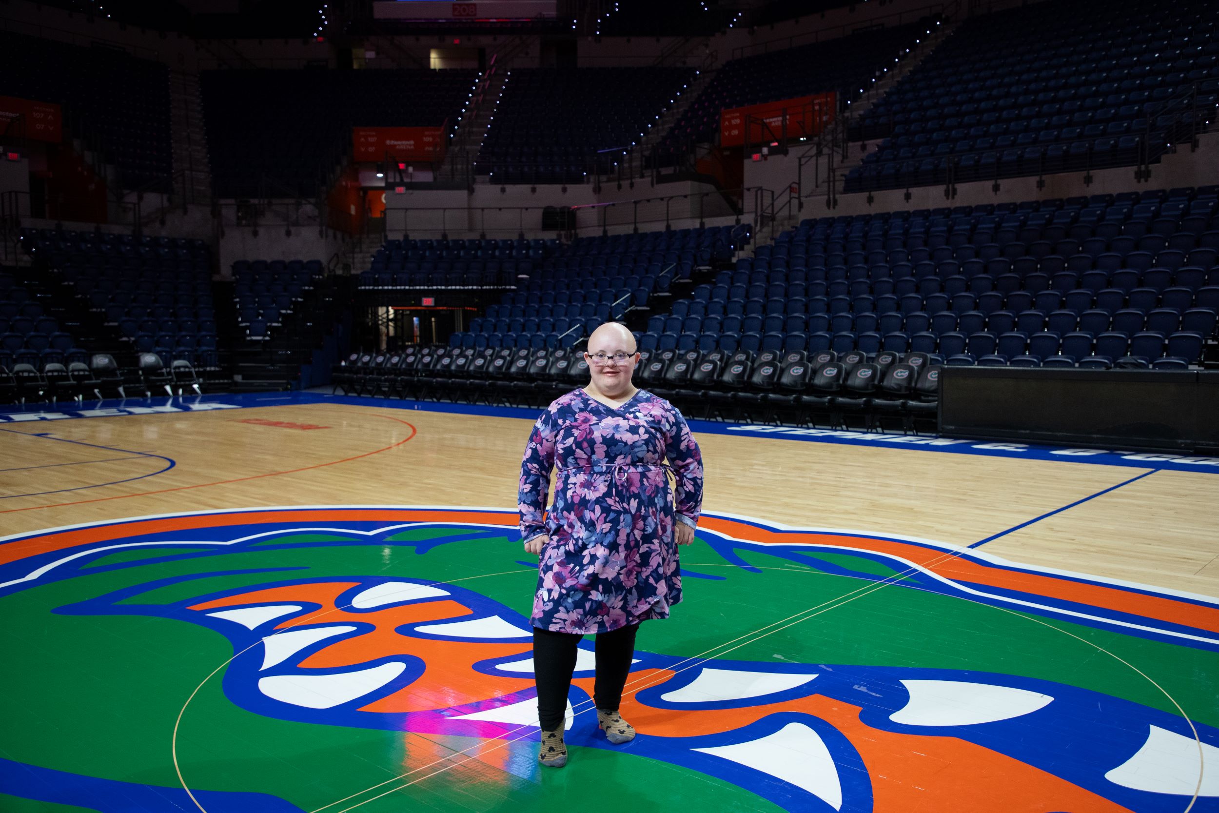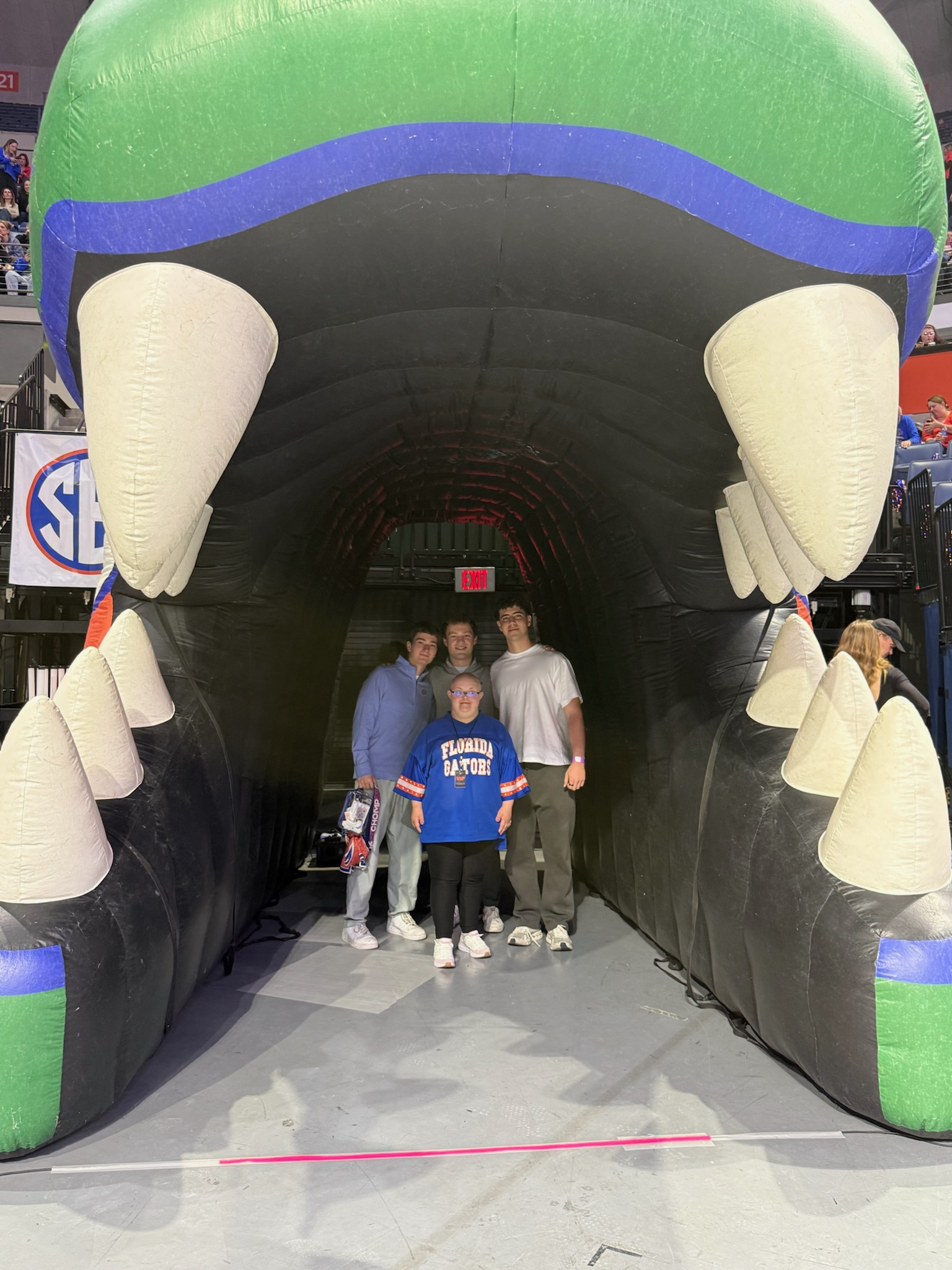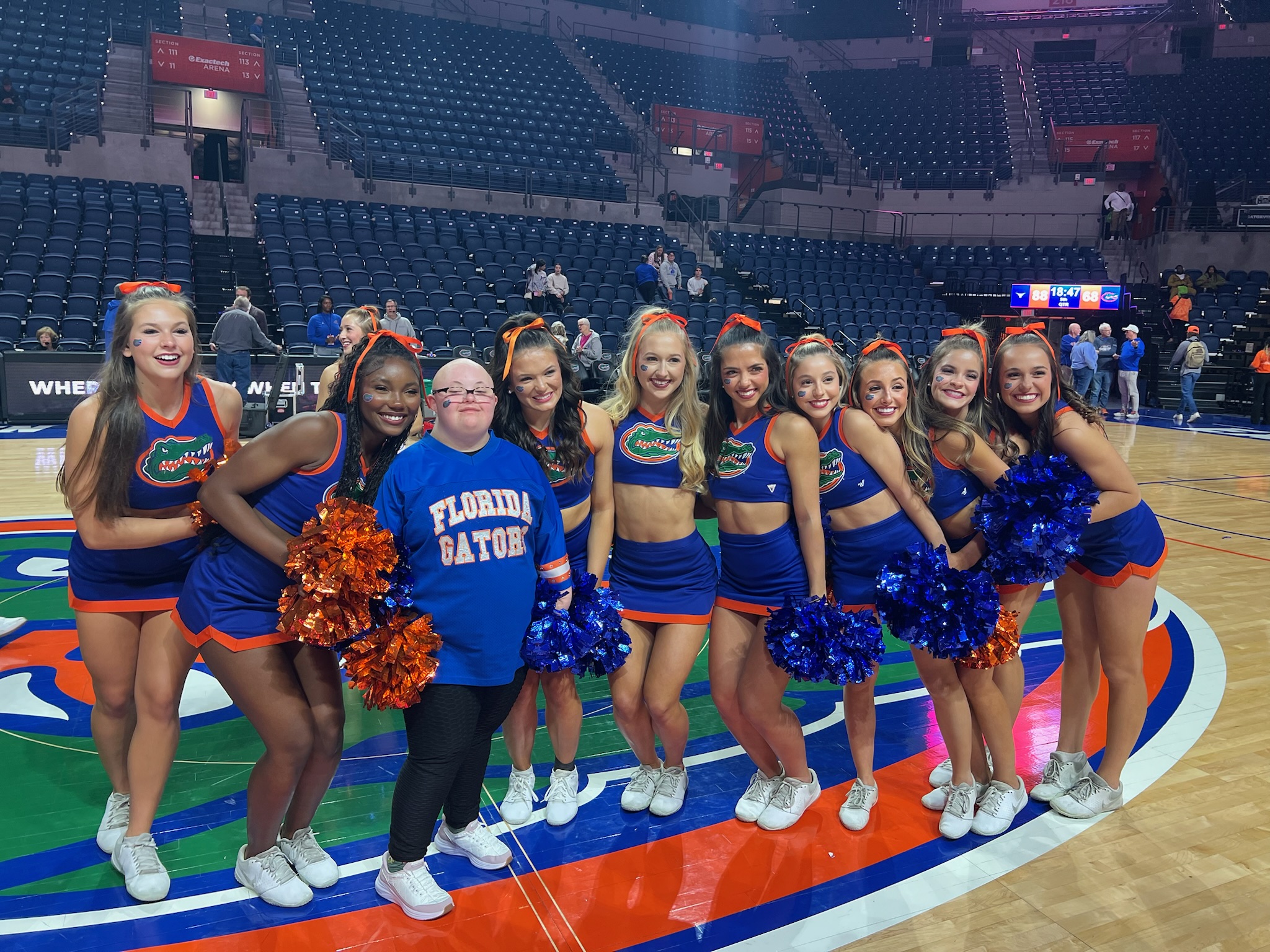 The day continued with a locker room tour at Ben Hill Griffin Stadium and a personalized shopping spree at Alumni Hall, where Alex Tench and his team made Sophie and her family feel incredibly special. After a little rest at Hotel Eleo, the group enjoyed dinner at Chuy’s before heading to Exactech Arena for the game.