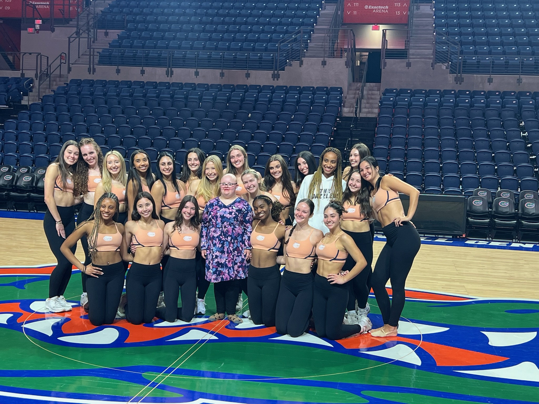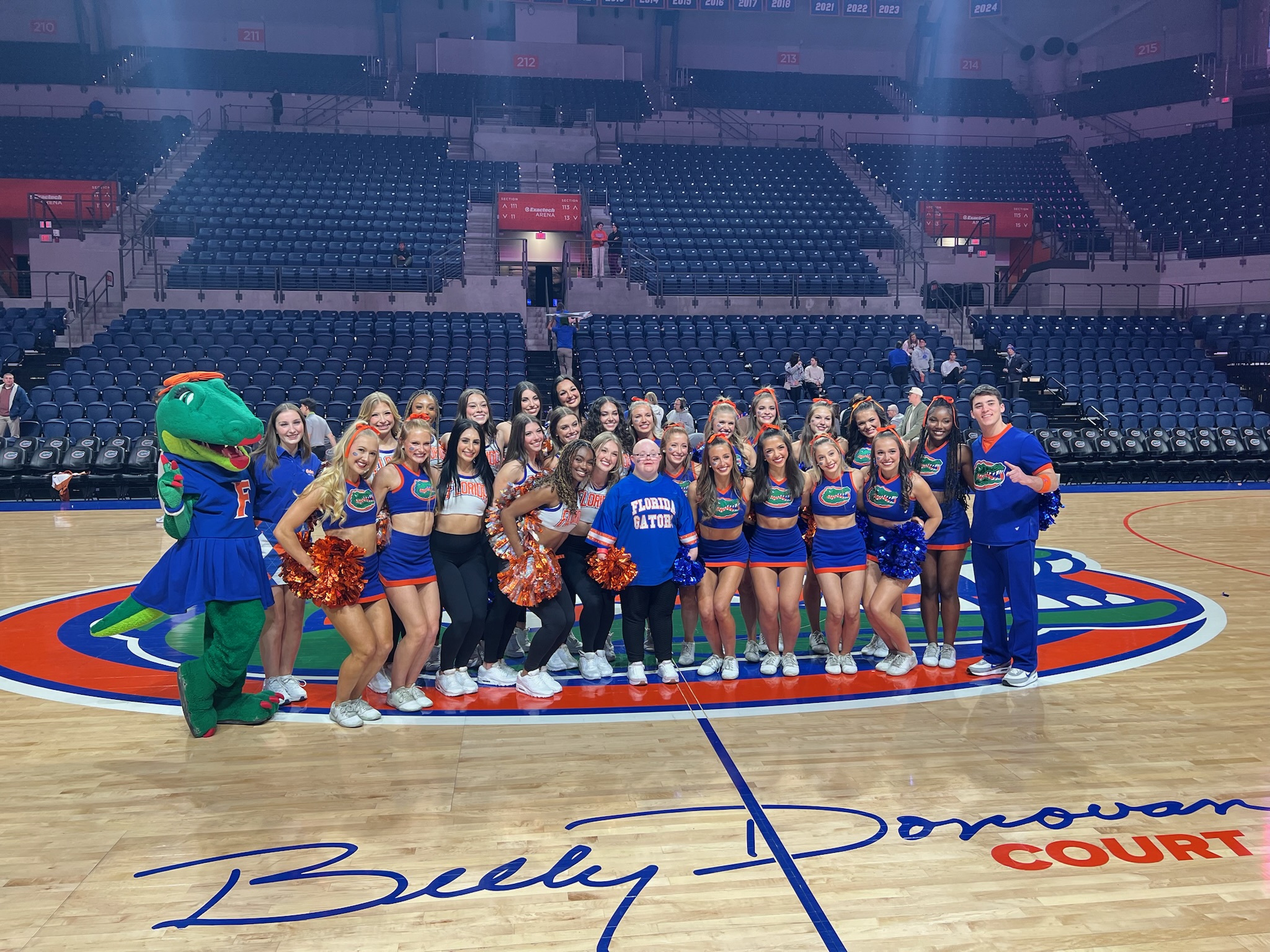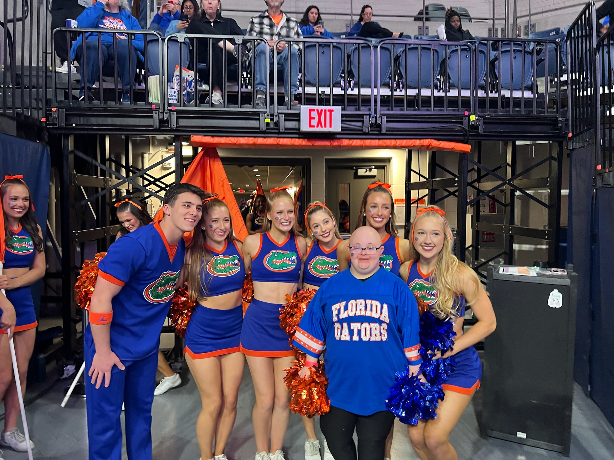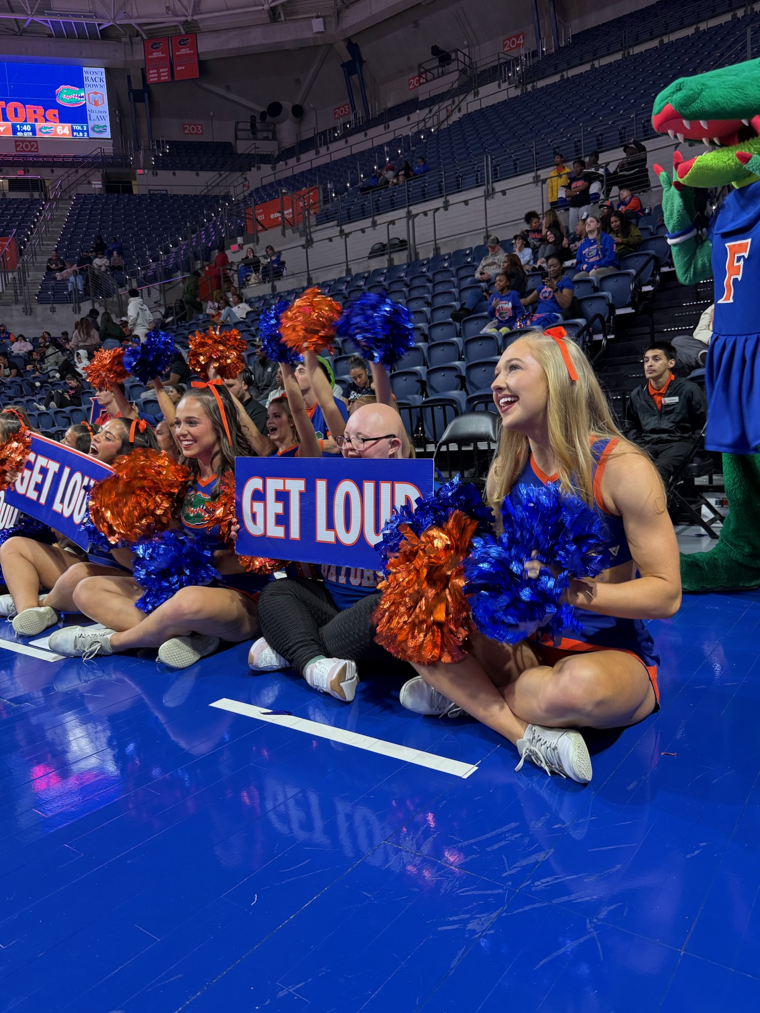 That evening, we headed to gymnastics practice, where Sophie was welcomed with so much love once again. We took team and coach photos, and Sophie watched warmups, practice, and the team run out of the Gator head. She stood down by the mats during introductions, taking in every moment up close. The cheerleaders made sure to greet her again, making her feel just as special as she had all weekend.